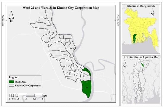 In order to determine the appropriate study area, we conducted an analysis of existing literature pertaining to climate change occurrences in the southern coastal region of Bangladesh. The study area was selected by identifying the region most susceptible to climate change events, as delineated in prior studies. The unions in southern coastal Bangladesh were classified as regions with high to extremely high socio-economic vulnerability [51]. Furthermore, these unions are significantly impacted by climate-induced disasters and are acknowledged as locations with a high susceptibility to such events [70]. In order to comprehend the effects of climate change on the urban climate migrants from southwest coastal Bangladesh, we also looked into the literature. The research leads us to choose the informal settlements from Khulna City Corporation’s Wards 22 (Notun Bazar, Rupsha Slum) and 31 (Matha Vanga, Lobon Chora) as our study area (see urban locations from Figure 3) based on the concentration of climate migrants [71,72].