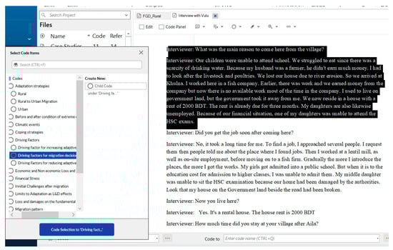 This study included thematic analysis approaches. Thematic analysis aims to identify noteworthy or intriguing patterns in the data, known as themes, which can be used to discuss the research or convey a certain point [75] (see Figure 5 for details). Prior to commencing the theme analysis, the researchers identified the potential segments of the interviews in order to gather the pertinent pieces of material that are of interest to the study. The interviews were transcribed from the audio recordings using the process of modified transcription. The purpose of this transcribing option is to streamline the documents by eliminating superfluous words or utterances. The study utilized NVivo 14 for coding purposes (see Figure 6 and Figure 7 for details). Prior to commencing the coding process, we initially identified our specific area of focus for this study and ensured that our coding remained consistent with the research objectives throughout the duration of the investigation. We produce revised transcriptions from every interview recording. We extract semantic codes by analyzing the literal meaning of the text. The purpose of these semantic codes is to produce latent codes, which are primarily researcher-driven codes that enhance the significance and relevance of the coding process to our research. Subsequently, we identified coding commonalities and proceeded to create clusters, which were then categorized and labelled. For instance, we have identified two distinct categories of driving variables (structural and structural) that impact the adaptive capacity of rural individuals. We have identified a grand total of six groups falling within the overarching theme of ‘adaptation strategies’. Subsequently, we examined the pattern and correlation between the topics in order to produce a thematic map.