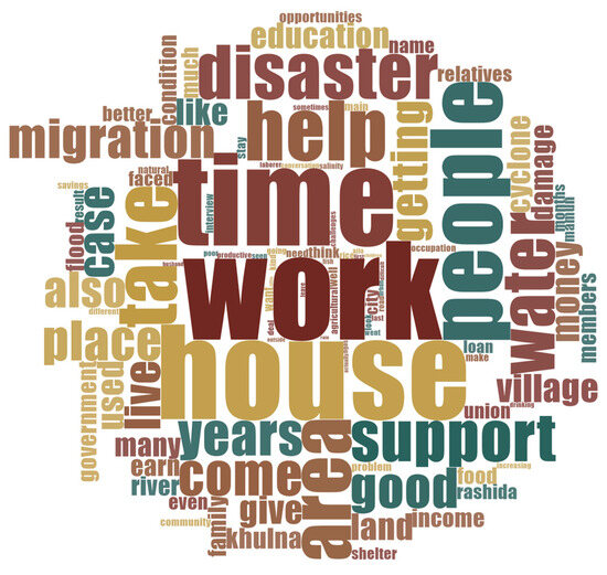 Farmers make up the bulk of the region’s population. In addition to farming, the locals operate brick kilns, go fishing, and drive vans. Most of the time, tidal surges, cyclones, and floods have a direct impact on people’s livelihoods. They encounter severe financial difficulties and a lack of employment options during the off-season or post-disaster period. It is at this point in their lives that they decide to move to the closest town or territorial center. It has been observed that migration is increasingly occurring as a means for people to cope with shocks and stress related to their livelihood. In this case, migration is a crucial adaptation tactic. Both catastrophic disaster occurrences and seasonality pose a risk to their means of subsistence. For instance, throughout the summer, they must spend longer hours in the field because of the intense heat and humidity. In this case, the amount of health risk they assume is disproportionate to the profit they make. Once more, the effects of the drought cause them to face a shortage of water during the summer. This results in poorer crop production, which directly impacts their means of subsistence. Because of this water limitation, they are forced to wait until even the rainy season to produce rice. Therefore, seasonal migration occurs in the quest for jobs throughout the summer months, primarily as day labor, to the closest upazila, district town, or regional or territorial hub. Figure 8 represents the words most frequently uttered by the interviewers concerning the adaptation and coping strategies to address the loss and damage.