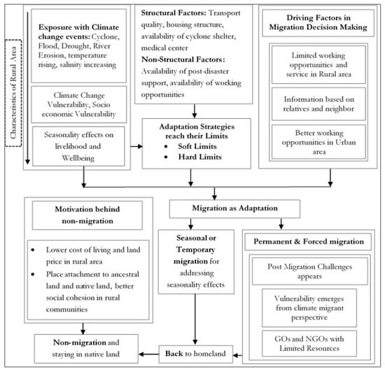 In summary, the study revealed that rural inhabitants in coastal areas typically engage in two types of migration: seasonal and permanent (see Figure 9). They often engage in seasonal and temporary movement to adapt to the impacts of seasonality on their livelihood. Alternatively, people opt for permanent migration as a means of adapting to adverse circumstances, often as a response to significant loss and damage caused by extreme climate events such as river erosion, cyclones, and floods. Permanent migration is often involuntary, occurring when individuals have no other viable means of survival in their area of origin. Individuals who are impacted by river erosion experience a loss of their identity and sense of belonging, leading them to relocate to urban regions permanently. A significant discovery from the study is that individuals who are affected resort to seasonal movement as an adaptive measure to mitigate the constraints imposed by seasonal impacts. For instance, as a result of inadequate income-generating prospects during the non-farming season in rural areas, they opted for temporary migration. The non-agricultural seasons are particularly susceptible to gradual events such as temperature and salinity increases, which are caused by insufficient rainfall and scarcity of fresh water. Conversely, permanent migration decisions are made as a means of adapting to extreme climate occurrences such as cyclones and river erosion when they reach their maximum capacity. In addition to these factors, social networks also exert a significant influence on the decision to migrate. Many individuals living in rural areas choose to permanently relocate due to the presence of extensive social connections with their relatives in metropolitan areas and neighbors in rural areas. This social network also facilitates users in gaining knowledge about superior employment prospects and improved service amenities in urban areas, hence motivating individuals to undertake permanent relocation. Nevertheless, some individuals who are impacted do not embrace migration as a viable approach for adaptation. Several factors serve as catalysts for non-migration. The profound emotional connection to their native land and the strong sense of belonging to their ancestral homeland serve as powerful incentives for people to refrain from migrating under any circumstances. Moreover, the financial burden of residing in metropolitan regions is an additional worry for individuals who do not migrate.