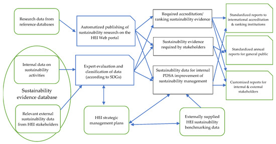 A good UNIST practice related to the expert evaluation of the sustainability evidence for HEI activities has been incorporated into the model. At the same time, an improved database system with internal browsing and search functionalities should be considered a support tool for sustainability experts serving on SDG (sustainability) evaluation and reporting (sub)committees at an HEI. It could be implemented as a stand-alone information system (IS) or a CRIS module. Such an IS can be easily used for centralized storage of HEI evidence for different purposes, including sustainability reporting and reporting for other international accreditation and ranking requirements. Some functionalities can be devoted to entering external data by HEI stakeholders, who can provide limited access to the system and the opportunity to continuously monitor the previously agreed HEI performance indicators relevant to their legitimate interests.