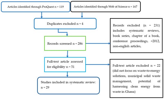 The systematic review procedure encompassed a sequence of four distinctive stages. In September 2023, we initiated the evaluation process. During the initial phase, we established a comprehensive list of pertinent terms to be employed in subsequent searches. These keywords were sourced from the existing literature and an extensive thesaurus. Upon conducting a thorough examination, four duplicate items were identified and subsequently removed. Transitioning to the subsequent steps, we engaged in a screening process, wherein 231 items were excluded from the initial pool of 286 articles based on predefined eligibility criteria. The third phase entailed accessing and scrutinizing the complete articles obtained, amounting to a total of 51 articles. Following a rigorous review, twenty-two of these articles were determined to be ineligible as they did not pertain to waste-to-energy solutions, lacked an empirical basis, failed to address municipal solid waste management, or did not explore the potential of clean energy generation from waste in Ghana. Upon concluding this final round of evaluation, a total of 29 articles met the criteria and were selected for inclusion in the review, as illustrated in Figure 1.