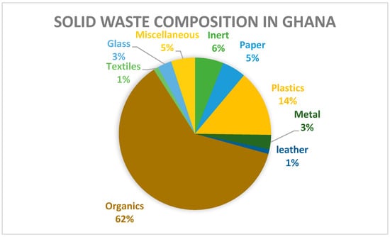 Effective waste management planning in Ghana is hampered by a lack of comprehensive national data on trash generation and composition. Numerous isolated studies have been conducted to determine the amount and composition of trash produced in the country. For instance, one study [] found a generation rate of 0.47 kg/person/day in several Ghanaian cities. This translates to around 12,710 tonnes per day and approximately 4 million tonnes annually. This generation rate is expected to rise as population growth continues. According to [], in Accra, Ghana, residents with greater incomes generated more trash, specifically 0.6 kg per capita per day. Middle-income groups, on the other hand, generated trash at a rate of 0.4 kg per capita per day, while low-income groups produced waste at a rate of 0.3 kg per capita per day. In a similar vein, another study [] found that the per capita trash produced in Vittin, a high-income community in the Tamale Metropolis, is 0.33 kg per person per day. Research on trash characterization in various Ghanaian cities and towns found a considerable presence of organic components in the waste stream. Similarly, ref. [] found that organic materials accounted for around 61% of total trash produced in Ghana (see Figure 2). The authors of [] conducted waste characterization investigations at the Kumasi Metropolitan Assembly’s (KMA) final dump site and observed that organic waste constituted an average of 40.32% of total trash. A recent investigation conducted by [] at Cape Coast University (UCC) found that organic waste accounted for 54.4% of total household trash in the senior and junior staff residential areas. Other waste types, such as plastics, paper, textiles, metals, and glass, have lower shares, ranging from 1.1% to 31.4%. Takoradi Sub-Metro research focused on the characterization and measurement of municipal solid trash. In their survey, they found that biodegradable materials accounted for 60.0% of solid waste, plastics for 11.5%, inert materials for 8.0%, paper and cardboard for 7.1%, miscellaneous materials for 5.0%, textiles for 2.9%, metals for 2.4%, glassware for 1.5%, and leather and rubber for 1.2% []. According to the findings in [], three communities in Ghana’s Eiisu-Juaben municipality generated more than 30% of organic trash. The authors of [] undertook a study to investigate the composition of trash found along the shores of Ghana’s coastal lagoons. The findings revealed a slightly varying distribution of litter categories, with plastics taking up 50% of the total, which was followed by organic materials at 20%, paper at 10%, textiles at 10%, and miscellaneous debris at 10%. Notably, previous research has demonstrated that seasonal fluctuations have no statistically significant effect on the nature and generation of household waste. However, seasonal variations impact the amount of outdoor trash, particularly yard waste, with trimmings being a major factor [].