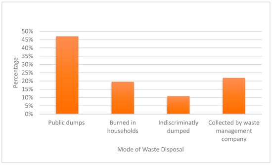 The aforementioned observation is supported by data from [], which show that approximately 47.8% of solid waste is disposed of in public dumps, 19.5% is incinerated by households, 10.8% is indiscriminately dumped, and only 21.9% is collected by waste management companies (see Figure 3). Another study [] also revealed that, like other developing nations, Ghana faces significant challenges in managing its municipal solid waste (MSW) due to a lack of resources and knowledge. Despite various governments implementing decentralization policies and reform projects, municipal solid waste (MSW) management remains inadequate. The current situation has resulted in inferior trash collection infrastructure in many communities around the country, including insufficient storage receptacles and illegal waste disposal activities. According to [], in order to achieve sustainable waste management in Ghana, a comprehensive plan that includes waste analysis, reduction, valorisation, and recycling must be implemented. As a result, including waste-to-energy technologies in an integrated solid waste management (ISWM) framework would significantly contribute to waste reduction and power generation in Ghana, thus supporting sustainable development.