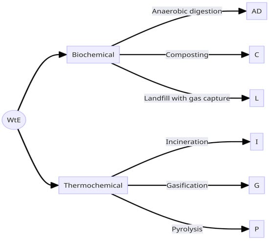 In the present investigation, we zeroed in on a few key biochemical and thermochemical processes: anaerobic digestion, incineration, gasification, and landfill gas (see Figure 4). This specific focus is driven by a profound understanding of the local Ghanaian context and a commitment to sustainable waste management. We considered the progress of these technologies in their development and the availability of data on them within the context of Ghana. Furthermore, in accordance with the literature [,,], the physical and chemical characteristics of Ghana’s municipal solid waste (MSW) enable the implementation of the aforementioned waste-to-energy (WtE) conversion procedures.
