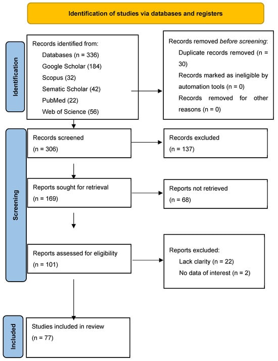 The current study comprises an exploratory literature review aimed at holistically summarising themes of indigenous waste management practices. Subsequently, papers were selected to inform the review by extensively searching the range of multiple scientific reputable databases. In these databases, key thematic search terms such as “indigenous knowledge”, “sustainability”, AND “indigenous solid waste management” and “indigenous knowledge systems AND solid waste” were used to narrow down the search within the relevant scope of indigenous waste disposal methods. This systematic search was designated to capture a broad range of academic papers and any other associated technical reports within the indigenous waste management practices sector, thus avoiding comprehensively including all studies that may not be directly related to the topic at hand. As such, the Preferred Reporting Items for Systematic Reviews and Meta-analyses (PRISMA) reporting was fundamental to achieve this systematic search. Thus, in the current study, PRISMA, as depicted in Figure 1, facilitated the identification and inclusion of the pertinent literature. In this study, a comprehensive analysis was conducted on a total of 336 papers to fulfil the objectives of this research.