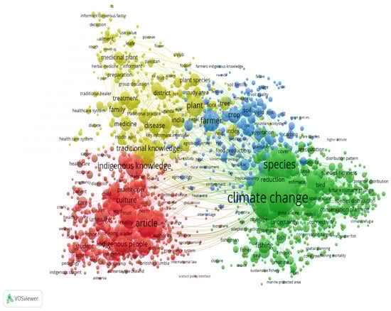 That is, through the extensive literature search, over 17,000 publications associated with “indigenous knowledge” were retrieved, in contrast to a meagre 57 articles linked to indigenous waste management practices. It is important to note that within the Web of Science database, the 57 publications it is the maximum number. This is a cause for concern, especially in Sub-Saharan Africa where solid waste management is a challenge, especially within rural communities, yet the indigenous cultural practices of waste disposal methods and their sustainability aspect are neither well documented nor well known. As such, this research aims at bridging this gap. The overall analysis associated with the indigenous knowledge context was performed using the specialized software VOSViewer. Subsequently, an enhanced visual representation of research undertakings associated with indigenous knowledge systems was generated, as shown in Figure 2.