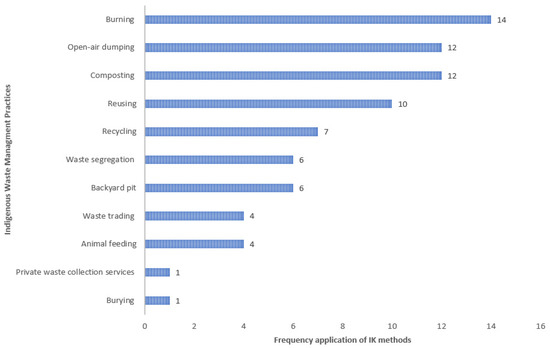 Therefore, in order to guarantee recognition of the value of indigenous knowledge as a system capable of addressing global environmental issues, it is critical that researchers of indigenous waste knowledge systems focus on the evaluation of sustainability practices associated with the knowledge system. Accentuating the positive role of indigenous knowledge in the field of environmental studies, McGregor [2] posits that science and technology, in isolation, have been reported to be unable to resolve the current environmental challenges. Therefore, alternative techniques are necessary, particularly those with extensive and proven track records such as indigenous ecological knowledge that have drawn more attention in recent decades, especially in the field of sustainable development. In as much as this premise is true for agriculture, climate change, biodiversity, water quality management, fishing, farming, education, and conservation [78,79,80,81], it remains a fallacy for indigenous waste management practices not because the skills and technologies of indigenous communities employed for waste disposal are incapable of being sustainable but due to limited research that has left a substantial gap in this regard.