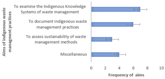 From across the globe, studies associated with indigenous waste management practices have been scrutinized and their sustainability discrepancies are visually illustrated, as demonstrated in Figure 4. Although indigenous knowledge systems are seen as crucial for achieving sustainable development objectives, Figure 4 indicates that most of the available research on indigenous waste management methods does not focus on measuring the sustainability practices of solid waste management. It is for this reason that statistically, only a small proportion (15%) of research has examined the sustainability of indigenous waste management practices used for solid waste. Evaluating these practices, the current study has discovered that researchers used an assessment criterion that incorporated a triple-bottom-line framework associated with environmental, social, and economic sustainability. That is, researchers evaluated indigenous waste management practices against the environmental, economic, and social impacts. However, one cannot help but notice the absence of quantitative indicators since the bulk of their sustainable indicators are of a qualitative nature. Moreover, in contrast to sustainability, a significant majority (85%) showed little interest in evaluating the sustainability of these indigenous waste management methods (Figure 4). Moreover, these inconsistencies are not surprising, since these results correlate with most of the primary goals of the conducted research studies, whose aim was not to assess the sustainability aspect of the disposal methods being used, as shown in Figure 5 below. This observation is reinforced by the overview aims of the research studies carried out within indigenous communities, focusing on the management of solid waste using indigenous knowledge.