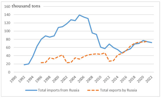 Exports of crab from Russia and imports by international partners (thousand tons). Sources: author’s creation using the data of comtrade.com (exports of Russia and imports from Russia by the countries of the world, HS codes 030614 and 030624/030633).