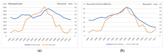 IUU crab harvesting (thousand tons, right axe) and the number of crimes (thousand cases, left axe) in Russia in 1996–2013. (a) IUU crab harvesting and the total number of crimes. (b) IUU crab harvesting and the number of armed robberies. Sources: IUU crab harvesting is a difference between total crab imports by partner countries and TAC (see Figure 1 for details); the total number of crimes and the number of armed robberies are obtained from the Statistical Committee of Russia, https://rosstat.gov.ru/ (accessed on 16 April 2024).