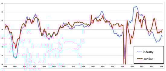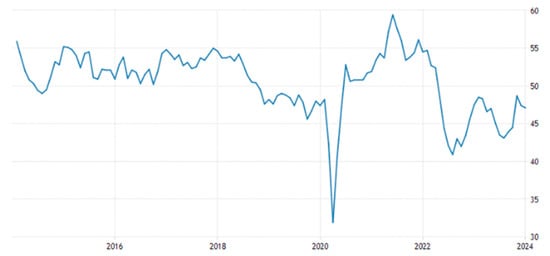 The decline in Poland’s PMI reflects both weak growth in new orders, production, and employment. The observed trend of PMI decline has been continuing since 2019. At that time, we had a pandemic that severely shook the markets and a temporary rebound in 2021 after the restrictions ended, when the economy started to grow slightly (Figure 2). Observing indices below 50 from 2022, we have a trend related to a significant deterioration of the economic situation and, consequently, an economic recession [,,].