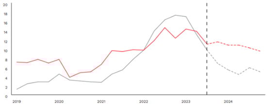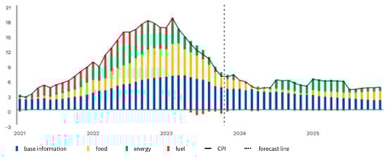 At the end of 2023, inflation slowed down regularly (Figure 3). Its average value in Poland in 2023 was 11.6%. Forecasts for 2024 are that the price growth rate will drop to 5.1%. At the same time, the double-digit rate of salary growth will be maintained, which is expected to reach 10.3% in 2024 []. Experts forecast that inflation will continue to decline in 2024, although it will still be far from the inflation target set by the National Bank of Poland, which is 2.5% +/− 1 percentage point (Figure 4). It is forecast that the downward trend will probably stop around the mid-year mark [].