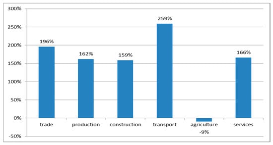 The industries that recorded the highest growth rate in the number of insolvencies included transport (+259%), trade (+196%), industrial production (+161%), and services (+166%). Transport was most affected by the slowdown due to lower production, lower consumption, and the re-education of inventories that companies carried out to rebuild distribution channels after the pandemic [] (Figure 6).
