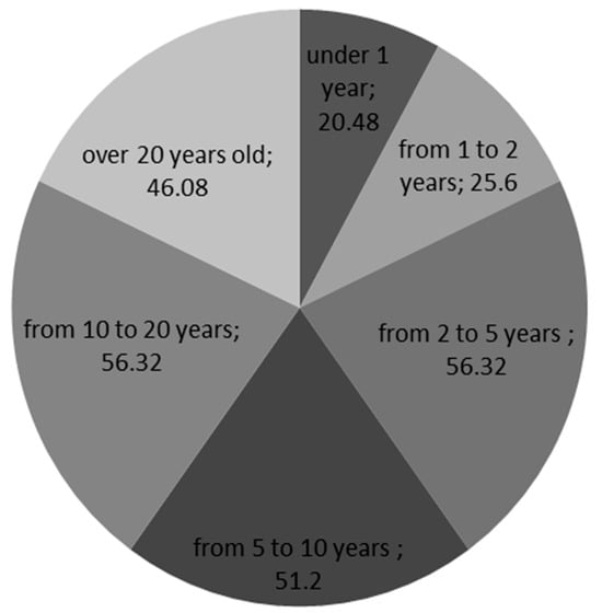 The highest growth rate of bankruptcies was recorded in the wood processing industry. The wood industry is facing a significant drop in demand. The largest declines were recorded in wooden garden architecture, construction joinery, and furniture. High prices of raw materials offered by the State Forests, as the main supplier of domestic raw materials, weaken the competitiveness of companies [,]. Wood of illegal origin appears in the market and is offered at much lower prices than wood of legal origin. Most often, this wood is obtained without the consent of national authorities or imported from countries in violation of sanctions imposed on Russia and Belarus. When supplying wood from Belarus, it is often falsely declared that the wood or wood products come from Kazakhstan or Kyrgyzstan []. Estimates of the Polish Chamber of Commerce for the Wood Industry show that, for example, the production of windows and doors decreased by an average of 35%. In turn, sawn timber—depending on the type—decreased from 29 to 43 percent. Furniture decreased by 30 percent, and floors by 35 percent [].
