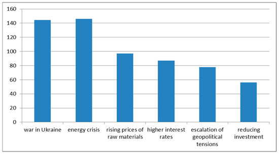 The aim of this work is to examine how companies respond to crisis challenges. The impact of the COVID-19 pandemic initiated a number of difficulties for Polish companies that they had to face. The changes concerned interrupted supply chains and the resulting problems with supply and business continuity. Other aspects that caused problems were changes in employees’ work, i.e., remote work. Due to the changes that occurred after the outbreak of the war in Ukraine and the subsequent energy crisis, companies had to face new challenges, i.e., rising prices of raw materials and ongoing inflation [,]. Another goal is to indicate what directions companies are taking in the face of threats that have occurred and what are their strategies for the future. The analysis of the research results is intended to answer which factors generate positive and negative factors for companies in the face of economic changes. The collected information will help determine whether companies have ideas on how to survive stagnation and improve their functioning. The research was carried out on a deliberately selected group of companies located in western Poland, representing various industries and sectors, in order to show the entire structure of companies in Poland.