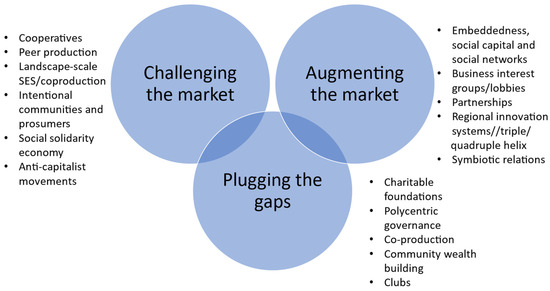 To better understand the presence of collaborative action as a means of providing goods and services in rural areas, we summarise here a selection of theories and explanatory narratives. Although the idea of civil society is central in collaborative action, there is no consensus on the nature of civil society [32] and not all theories and explanations relate solely to the place-based supply of goods and services. Some are firmly grounded in economic theory, while others comprise alternatives that sit outside the logic of mainstream market-led production. These might even be thought of as examples of a Polanyian double movement [33] and a reaction to late-20th-century neoliberalism and market logic. These explanations can be loosely grouped into three thematic areas of augmenting, challenging, and plugging gaps in the market (Figure 1), though this represents a simplified picture and, in reality, some overlap between these categories is inevitable. Collectively, they posit a place for collaborative activity as a key component of the ecosystem for providing goods and services.