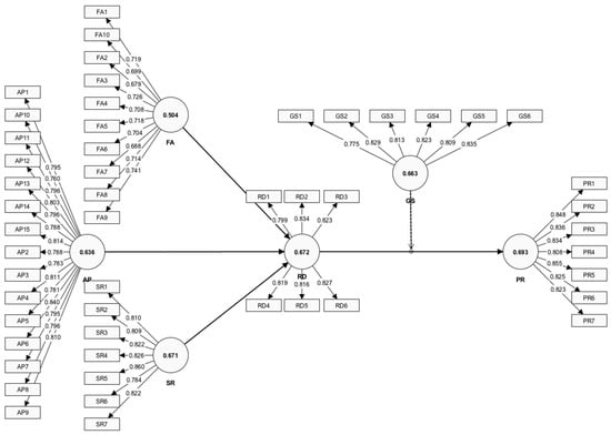Figure 2 illustrates a structural equation model (SEM) similar to Figure 1, with six variables: FA, AP, GS, RD, SR, and PR. The observed variables are connected to their respective variables, each showing standardized factor loadings (values next to the rectangles), indicating the strength of relationships. The circles indicate the variance explained (R-squared) by the variables, with values inside the circles. Figure 2 helps us understand the contributions of observed variables to constructs and the overall model fit.