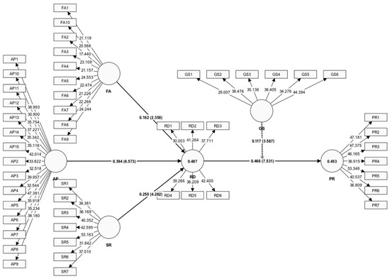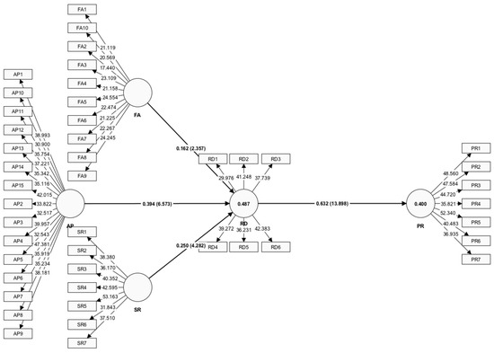This research paper employed the Heterotrait–Monotrait (HTMT) correlation coefficient to assess discriminant validity, which is considered a superior alternative to the Fornell–Larcker criterion and cross-loading tables [78]. As shown in Table 3, the HTMT values for all constructs were significantly below the recommended threshold of 0.85, indicating that the constructs are empirically distinct. This confirms the discriminant validity and enhances the credibility of the measurement model. Moreover, the results highlight the relationships between various constructs. For example, FA has a strong relationship with AP (HTMT value of 0.644), while government support shows significant correlations with both AP (0.637) and FA (0.657). PR is notably correlated with AP (0.689) and government support (0.596). RD also shows substantial correlations with AP (0.684), FA (0.609), government support (0.646), and PR (0.690). Social responsibility is correlated with multiple constructs, including AP (0.636), FA (0.675), government support (0.628), PR (0.636), and RD (0.641).