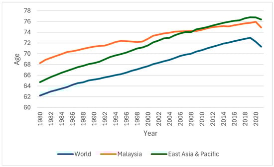 Life expectancy is a measure of the health and well-being of a nation. Life expectancy at birth indicates the number of years a newborn is expected to live. Figure 1 illustrates the comparison of the historical trend of life expectancy in Malaysia, the East Asia and Pacific region, and the world.