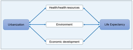 In this study, we develop a relationship framework, as shown in Figure 2, which describes the relationship between urbanization and life expectancy in terms of health resources, the environment, and economic development.