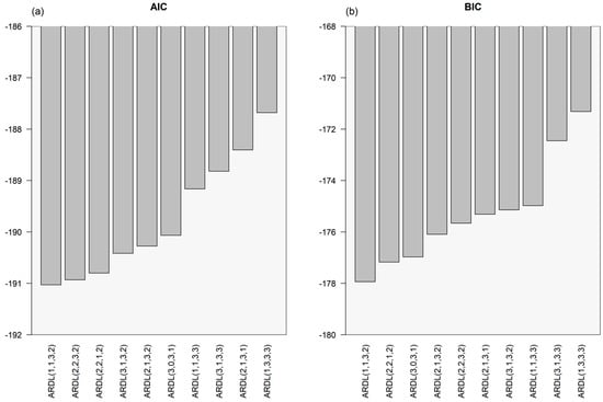We determined the appropriate lags for the ARDL model based on a partial autocorrelation function (PACF) plot, Akaike Information Criterion (AIC), and BIC. Based on the PACF plot, several models with a maximum lag of 3 [45] were compared. The model with the lowest AIC and BIC was chosen as the best model. Figure 4 below shows ten models with their AIC and BIC values.