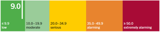 Morocco has achieved notable success in its export production growth and poverty reduction to below 5% of the population through its agricultural planning efforts over the last two decades [89], particularly the latter decade. In Morocco, the proportion of wasted and malnourished children declined from 25 to 15% and from 4 to 3%, respectively, and the country’s Global Hunger Index score decreased by 43% between 2000 and 2020 [90], with a score of 9.0 in the 2023 GHI (Figure 1) according to recent statistics, and a rank of 47th out of 125 countries [91]. Morocco has demonstrated notable progress in the reduction of poverty and famine [92]. If we include significant groups that lack access to fundamental social services and adequate shelter, however, food insecurity affects millions more individuals. It has been determined that North Africa has entered a food security crisis [90]. Specifically, food inflation has reached unprecedented levels in Morocco, Tunisia, and Algeria since the Arab Spring civil unrest a decade ago. Furthermore, Morocco has experienced a three-year average of 28% moderate-to-severe food insecurity rate from 2018 to 2020.