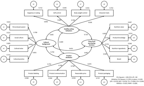 The model demonstrates a comprehensive view of how cultural background influences healthy eating behaviors and product attributes, which in turn affect clean food purchasing decisions. The significant loading factors indicate strong relationships among the constructs, emphasizing the critical role of cultural factors and product attributes in shaping consumer behavior regarding clean food purchases. The good-fit indices suggest that the model is well-specified and adequately represents the underlying data structure.