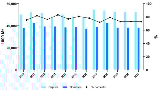This article does not examine fish catches and price dynamics but only provides typical values to permit the order of magnitude calculations (Table 1). The global catch of forage fish has fluctuated up and down, with values varying between reports; it decreased from 37 million Mt y−1 in 1994 to 25 million Mt y−1 in 2017 [23]. The amount of forage fish used for fishmeal and fish oil production has declined, according to some reports, from 27 million Mt (73% of the total) in 1994 to 16 million Mt (64% of the total) in 2017 and 22 million in 2018, a drop offset by the increased use of trimmings [23,86].
