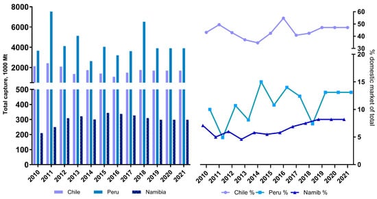 Figure 4. The total capture of forage fish and the percentage of total capture remaining in local markets in Peru, Namibia, and Chile. The bar chart corresponds to the vertical scale on the left graph, and the line graph corresponds to the vertical scale on the right.