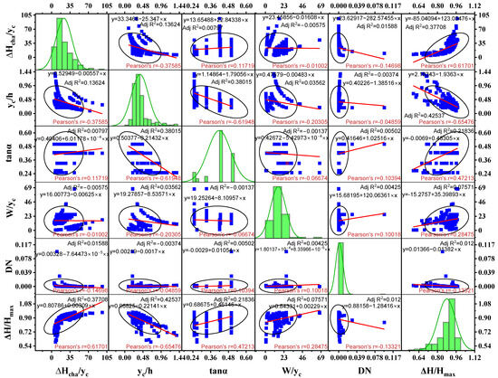 where DN = Drop number , Hmax = Maximum upstream head above chute toe, Hres = Residual energy, and ∆H = Hmax − Hres (m), ∆Hcha = Hcha − Nh. A graphical representation of the correlation between the input target variables for predicting energy dissipation of the stepped channel is shown in Figure 1.