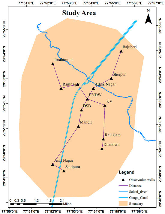 This study has been carried out in a small part of Roorkee block in Uttarakhand, India, which lies between longitude 77°50′30.012″ E–77°56′30.012″ E and latitude 29°48′15.012″ N–29°55′30″ N with a total area of 99.401 Km2 (Figure 3). This area is flat, with an altitude varying between 254 m to 279 m concerning mean sea level (MSL), and is covered by agricultural land (57%) and residential area (39%). The depth to water level at the mentioned wells lies between 5.30 to 9.00 m below the ground level (BGL). The seasonal fluctuation ranges between 0.47 m to 3.65 m. The sub-surface formations consist of a cyclic sequence of grey micaceous sand, silt, clay/brownish grey clay, sand, and gravels with occasional pebbles and boulders of the terrace, fans, and channel alluvium of quaternary age [67].