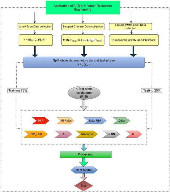 The present study considers three challenging issues that are relevant to various nations across the globe: energy dissipation of high-velocity flows, sediment regulation, and the assessment of GWL. Therefore, the analysis is based on the data collected in and around IIT Roorkee. Few machine learning tools are used to address certain specific problems, as addressed above. It is not enough to simply apply several machine learning methods and determine which model has an extensive relationship with the desired variables when it comes to water resource engineering and modeling. Rather, a model that not only gives well-predicted datasets but also preserves the flow behavior must be obtained. Therefore, it is also necessary to include the current experimental model and the existing experimental datasets into a single platform to obtain a reliable dataset that carries the physics of flow behavior. Thus, different AI models such as Random Forest (RF), Random Tree (RT), M5P (M5 model trees), M5Rules, Feed-Forward Neural Networks (FFNN), Gradient Boosting Machine (GBM), Adaptive Boosting (AdaBoost), Support Vector Machines kernel-based model such as SVM-Pearson VII Universal Kernel (PUK), and Radial Basis Function (RBF) are applied for each distinguished field of water resource engineering. However, many studies have been conducted on single well datasets to predict GWL. In all the cases of a single well, the AI tool has been implemented as a successive tool in predicting GWL. However, in the present study, the temporal gravity data of multiple wells are considered for the prediction of GWL.