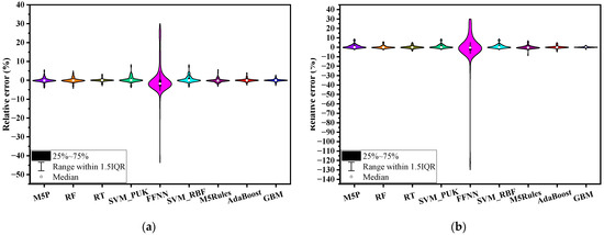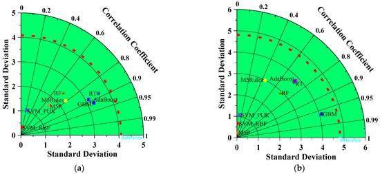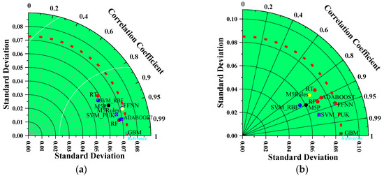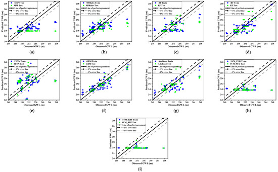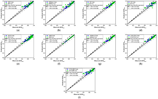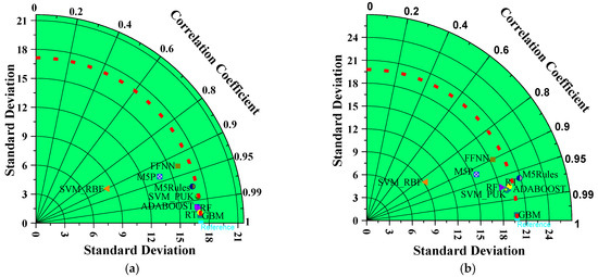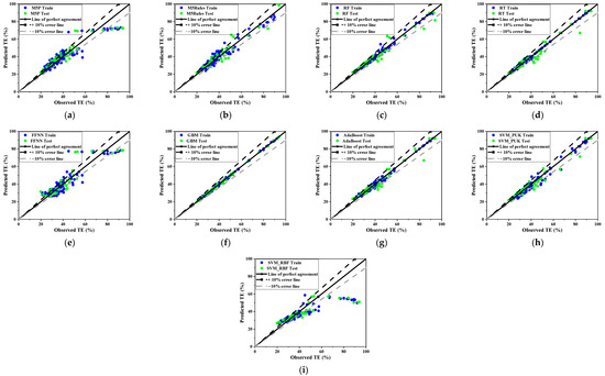 In this part, the flow over the stepped channel is analyzed using nine different AI-based models (RF, RT, M5P, M5Rules, FFNN, GBM, AdaBoost, SVM_PUK, and SVM_RBF). To model energy dissipation. five useful input parameters such as , , , , and are taken for modeling. An agreement diagram of training and testing of all the models is shown in Figure 5. From Figure 5, it is revealed that the M5P model has maximum scattered datasets during training as well as testing. For evaluation of model output results, four different statistical parameters (R2, RMSE, MAE, and NSE) are taken. Table 9 shows the statistical parameters of training and testing datasets.