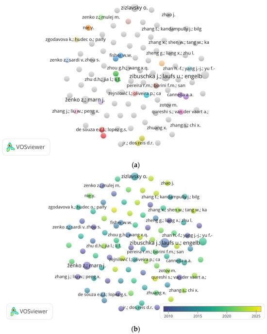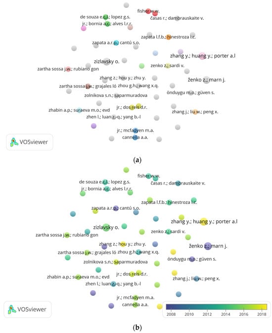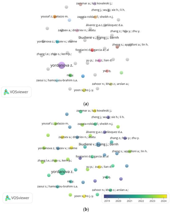 Co-occurrence network of authors between 2020 and 2024 limited to BMA, EEF, and SOC areas retrieved with the VOSviewer® software: (a) network visualization; (b) overlay visualization. Source: Author.