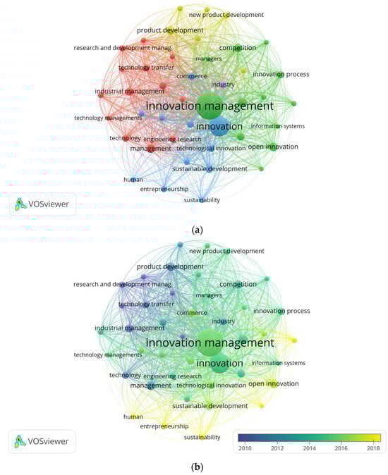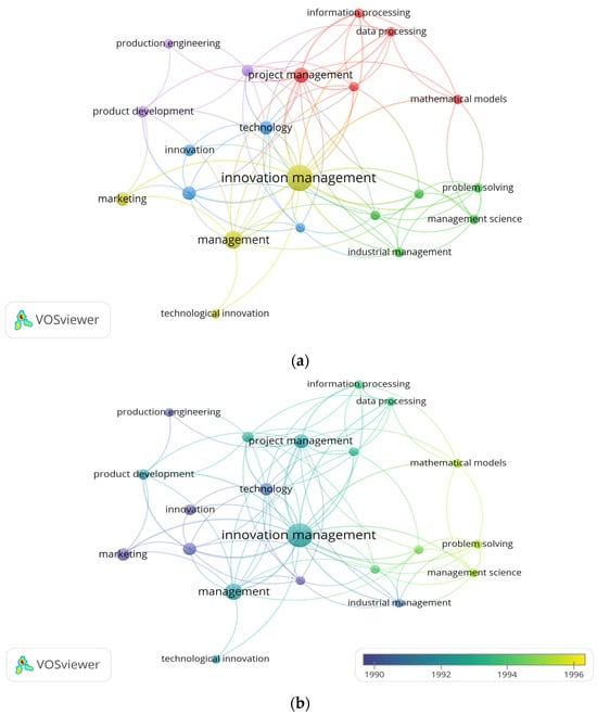 The co-occurrence network of terms extracted from the title, abstract, and keywords fields for all 27 IM-related areas are analyzed in Figure 9b. An overlay visualization using VOSviewer® was applied to comprehensively analyze the literature over the past 50 years. Figure 1 shows three stages in innovation management research. (a) The Initial Stage (1974–1995) is characterized by a near-zero publication rate, indicating a relative lack of interest in this research topic within the international scientific community. This stage saw the emergence of seminal papers that would later lay the foundation for subsequent research. (b) The Expansion Stage (1996–2019) is represented by violet and green clusters; this stage is dominated by aspects related to technology (technology transfer, technology management), innovation (innovation process, technological innovation), R&D, commerce, and development (R&D management, sustainable development, new product development, competition, commerce), industrial processes, and engineering (industrial management, product development, information systems, engineering research). (c) The Decline Stage (2020-present) is defined by the yellow cluster, this stage is characterized by aspects related to innovation (open innovation), entrepreneurship, and sustainability. The advent of AI is expected to provide a new impetus for this area of knowledge.