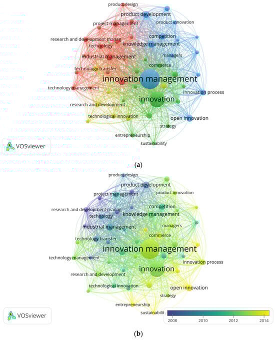 When analyzing innovation management across the 27 knowledge areas in Scopus, the results are integrated due to the interdisciplinary nature of the topic. This enriches the analysis, resulting in the formation of four clusters. The first cluster (blue) is led by innovation and aims to achieve sustainable development and foster greater entrepreneurial impulse within organizations (including intrapreneurship). The second cluster (green) is driven by competition and focuses on open innovation, creating quadruple propeller models involving public administrations, universities, companies, and the third sector (non-governmental organizations). It also emphasizes the importance of the Innovation Process and Information Systems. The third cluster (yellow) concentrates on product development to ensure sustainable profits at micro- and macroeconomic levels, emphasizing long-term benefits. The fourth cluster (red) focuses on management, including both technological aspects in R&D and industrial aspects, promoting technology transfer and research in related fields.