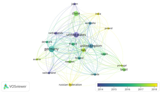 Co-authorship network of countries limited to BMA, EEF, and SOC areas retrieved with the VOSviewer® software: overlay visualization. Source: Author.
