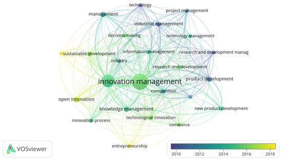 Between 1996 and 2019, as depicted in Figure 8, keywords related to innovation, such as “innovation process”, “open innovation”, “technological innovation”, “product innovation”, and “innovation”, have become more critical than in the previous phase. Also, the item “entrepreneurship” emerges as one of the determinants of boosting IM, as well as “product development” and keywords related to management (“project management”, “technology management”, “industrial management”, “research and development management”, and “knowledge management”) to foster business growth.