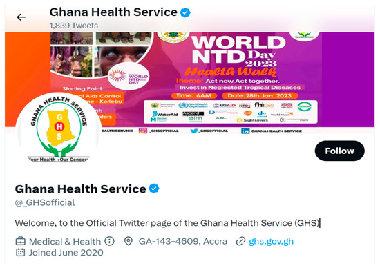 (@_GHSofficial) (Figure 1) is an officially verified account of the Ghana Health Service; it refers to the official Twitter (X) account of the Ghana Health Service (GHS). The Ghana Health Service is the main public sector agency responsible for the planning, implementation, and management of healthcare delivery in Ghana. The GHS account on Twitter (X) may be used to disseminate information about health issues, provide updates on public health campaigns, and engage with members of the public on matters related to healthcare in Ghana. (@_GHS official) exercised public health communication on Twitter (X) during the pandemic by delivering updates on COVID-19 statistics and educating the public on the need to wear masks, wash hands often, use sanitizers, and be vaccinated.