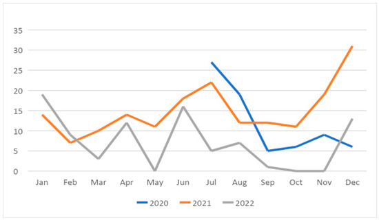 Figure 3 shows the total number of COVID-19-related posts made each year, with 2021 being the period with the most COVID-19-related content. Despite the Twitter (X) account’s creation in June 2020, the year 2020 recorded the least number of posts as they covered only just half a year (from July to the end of December 2020). Consequently, the chart indicates a drastic decrease in public health communication from 2021 to 2022.