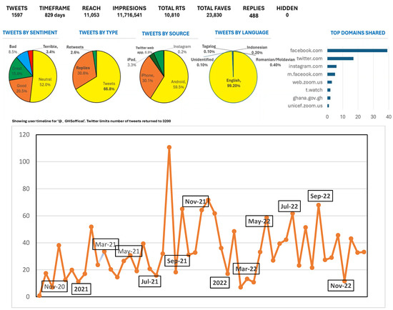 There was a massive increase in public health communication against the virus in the third quarter of 2021, with the COVID-19 pandemic acting as a trigger for a rise in the nation’s usage of Twitter (X) for health-related communication [82]. The government in Ghana gave great importance to communicating with its citizens through Twitter (X), which was not widely used in health institutions before, as there has been a qualitative shift since 2020 in the use of Twitter (X) in official health institutions.