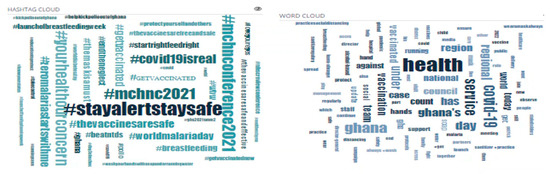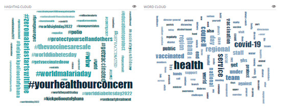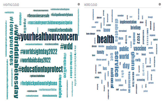 By analyzing the hashtag cloud and the word cloud of the GHS Twitter (X) account in Figure 7 such as #zeromalariasstartsithme, #kickpoliooutofghana, #helpkickoliooutofghana, #vaccinateyourchildnowagainstpolio, and #rollbackmalaria, the study found that in the last quarter of 2022, other health issues like malaria, polio, breast cancer, diabetes, and hepatitis gained more social media coverage than COVID-19-related issues. Figure 5 also showed that COVID-related hashtags were the most used hashtags in this period such as #covid19isreal, #stayalertandstaysafe, #maskisamust, #covid19, and #thevaccinsaresafe. Hashtags such as #pinkoctober, #helpkickoliooutofghana, #worldsightday, #worldaidsday, #breastcancerawareness, #worlddiabeteseday, and #earlydetectionsaveslife were also examples of the hashtags mostly used by the Ghana health service during this period.
