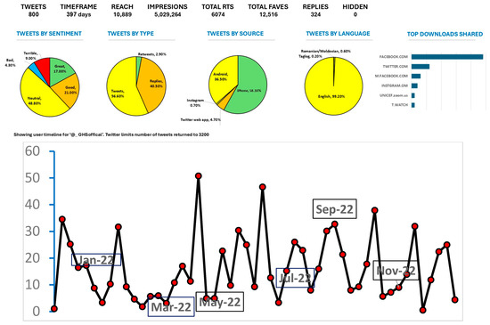 The service of the Twitter Search and Analytics tool socialbearing.com analytical application, which is a social media analytics and monitoring tool, was employed in order to give more details in the analysis of the gathered data. It provides real-time data and visualizations, such as graphs and charts, to help gain insights into social media trends. Ref. [79] stated that the social media analytics tool “Social Bearing” is used for studies using conversations or keywords on Twitter (X). The social media analytics tool “Social Bearing” can sort tweets according to metrics including reach, sentiment, engagement, and followers. Tweets can be filtered by top words and content type, whether it is mentions, links, or images [80]. The advanced Twitter (X) search function was used to filter the posts that contained the following keywords: “Coronavirus” and “COVID-19” during the period 2020–2022. After using the keywords coronavirus or COVID-19 to filter through the posts of GHS on Twitter (X) from July 2020 to 31 December 2022, a total of 338 posts relating to COVID-19 were gathered. The Ghana Health Service account was created in June 2020, but public health communication started in July 2020. That is why July 2020 was considered the starting point for gathering the data. Data analysis is the process of decomposing a phenomenon into its essential elements for better understanding [81].