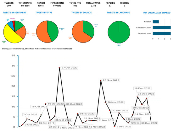 This study used text and statistical tools (numbers, tables, and charts) to present and analyze the collected data. We present the data gathered by analyzing the themes on the GHS Twitter (X) account with the aid of charts and images, where necessary. The analysis and interpretation took into account the main research questions. For that reason, the service of the SocialBearing analytical application, which is a social media analytics and monitoring tool, was also employed in order to give more details in the analysis of the gathered data. It provides real-time data and visualizations, such as charts and graphs, to help users gain insights into social media trends and enhance their social media policies. The application’s search engine attributes the GHS handle on Twitter (X), @_GHSofficial, to the collection of detailed data on the GHS. It then generates every piece of information regarding GHS on Twitter (X).