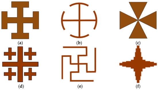 Some examples of cross unit cells: (a) Jerusalem cross []; (b) modified Jerusalem []; (c) bow-tie cross []; (d) fractal cross []; (e) convoluted cross []; (f) tapered cross [].