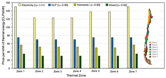 Price comparison according to heat production systems in kWh of useful thermal energy per Chilean pesos [29,36].