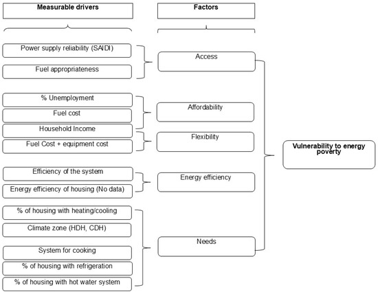 Factors that contribute to the vulnerability of energy poverty, measurable drivers and outcomes, and data available for Chile, adapted from [25].