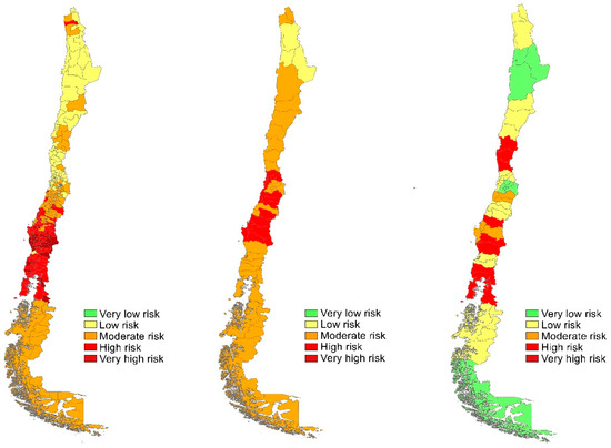 The fuel costs were adjusted by energy efficiency factors to reflect the true household expenditures. For instance, the regions where average fuel costs exceeded 78 CLP/kWh were deemed to be at very high risk, reflecting the burden of energy costs on low-income households [36,37]. These parameters were aggregated using a weighted model, assigning equal importance to income, unemployment, and fuel costs to derive a single affordability indicator at the provincial level.
