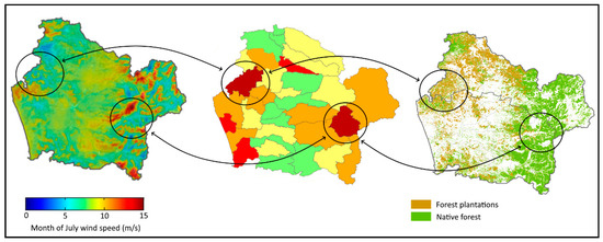 Wind speed in July (left), SAIDI (center), and forests (right) in the region of La Araucanía.
